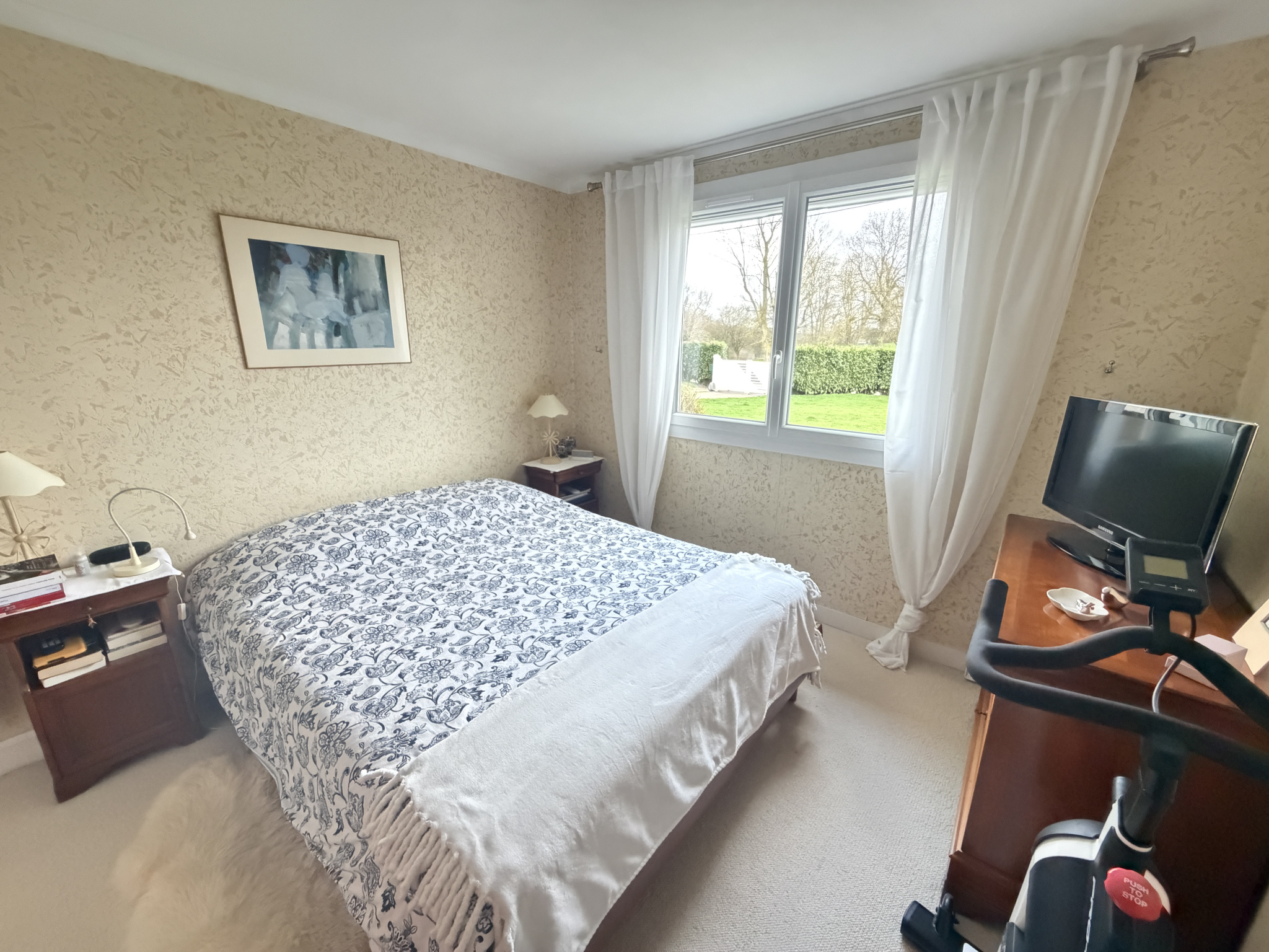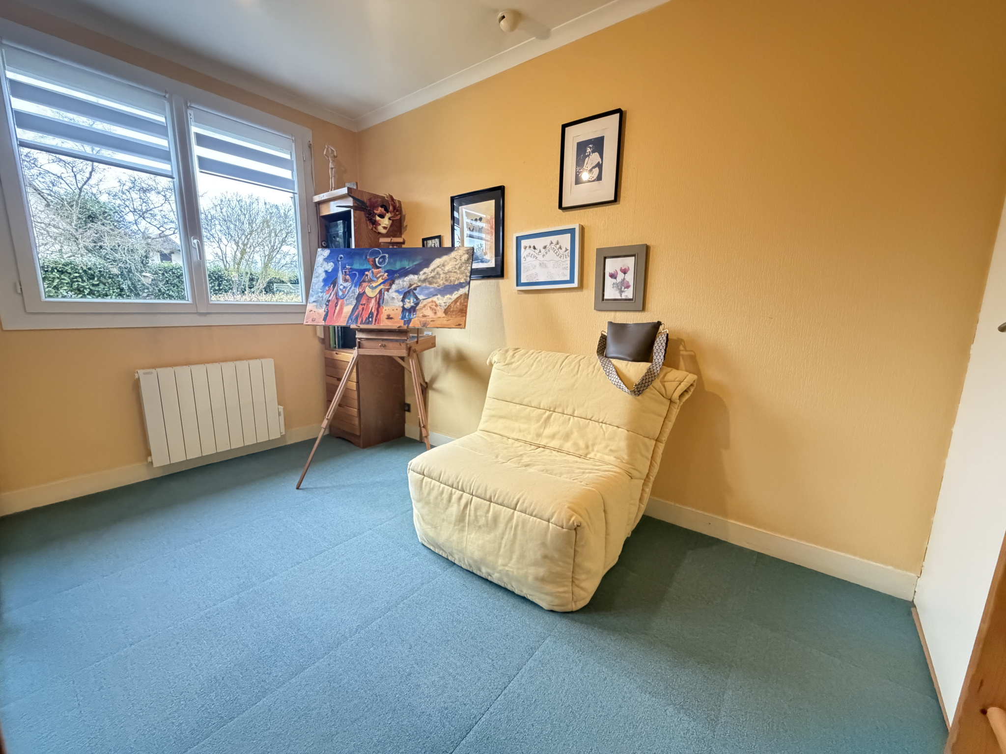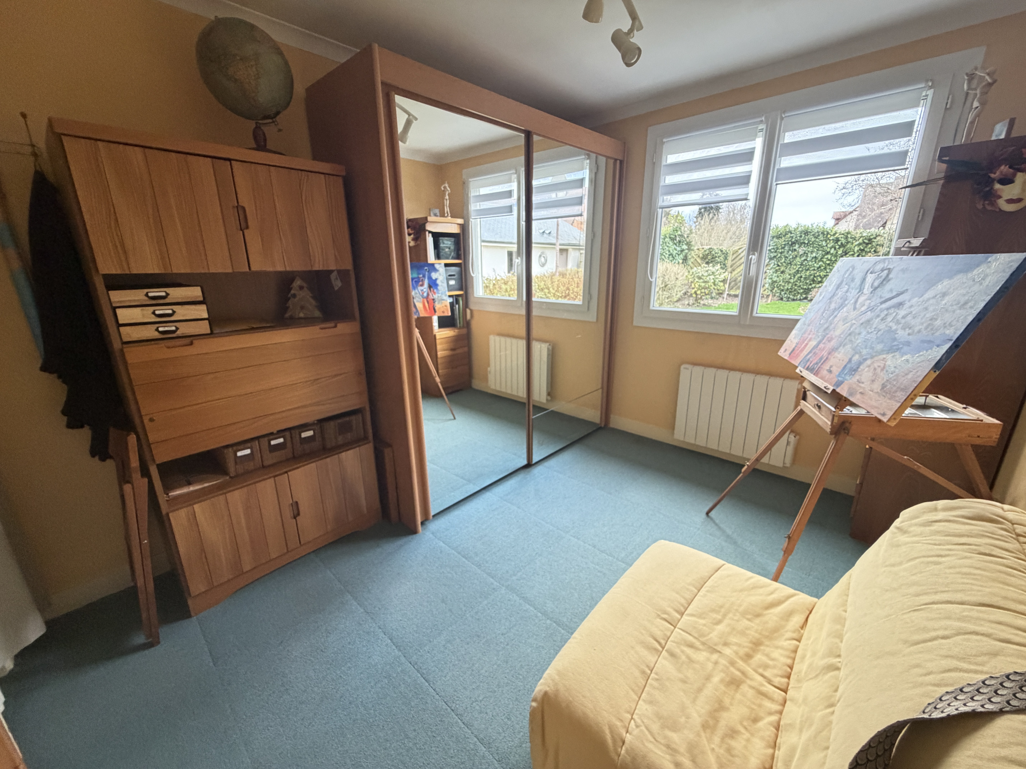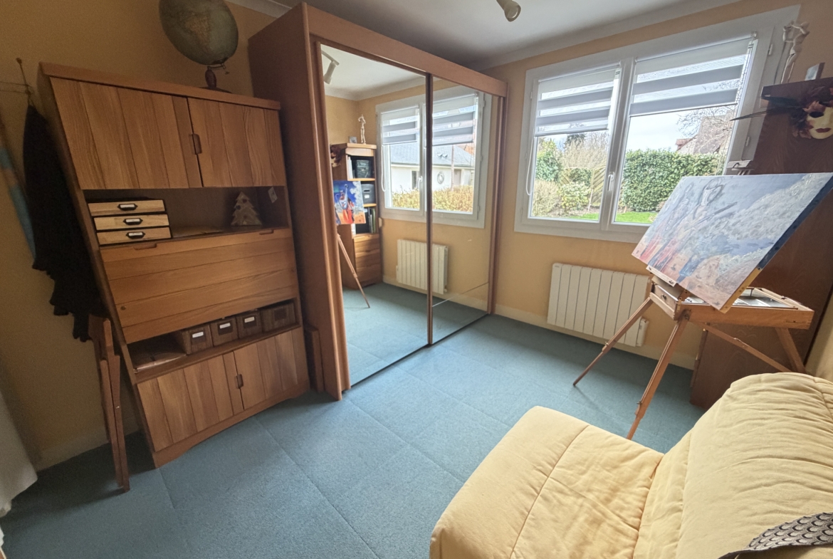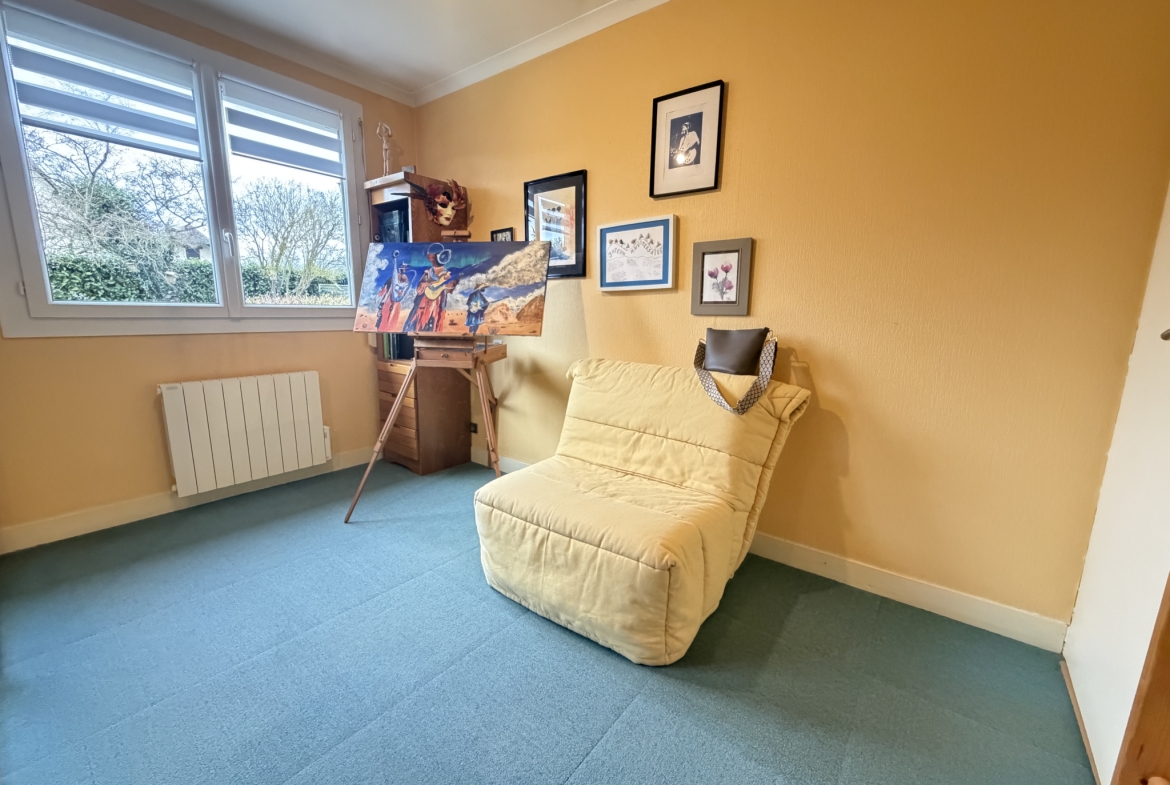 Un dégagement dessert deux chambres lumineuses, une grande salle de bains avec douche et baignoire, ainsi qu’un WC indépendant. Des combles aménagés, actuellement utilisés en espace de stockage, viennent compléter l’ensemble.